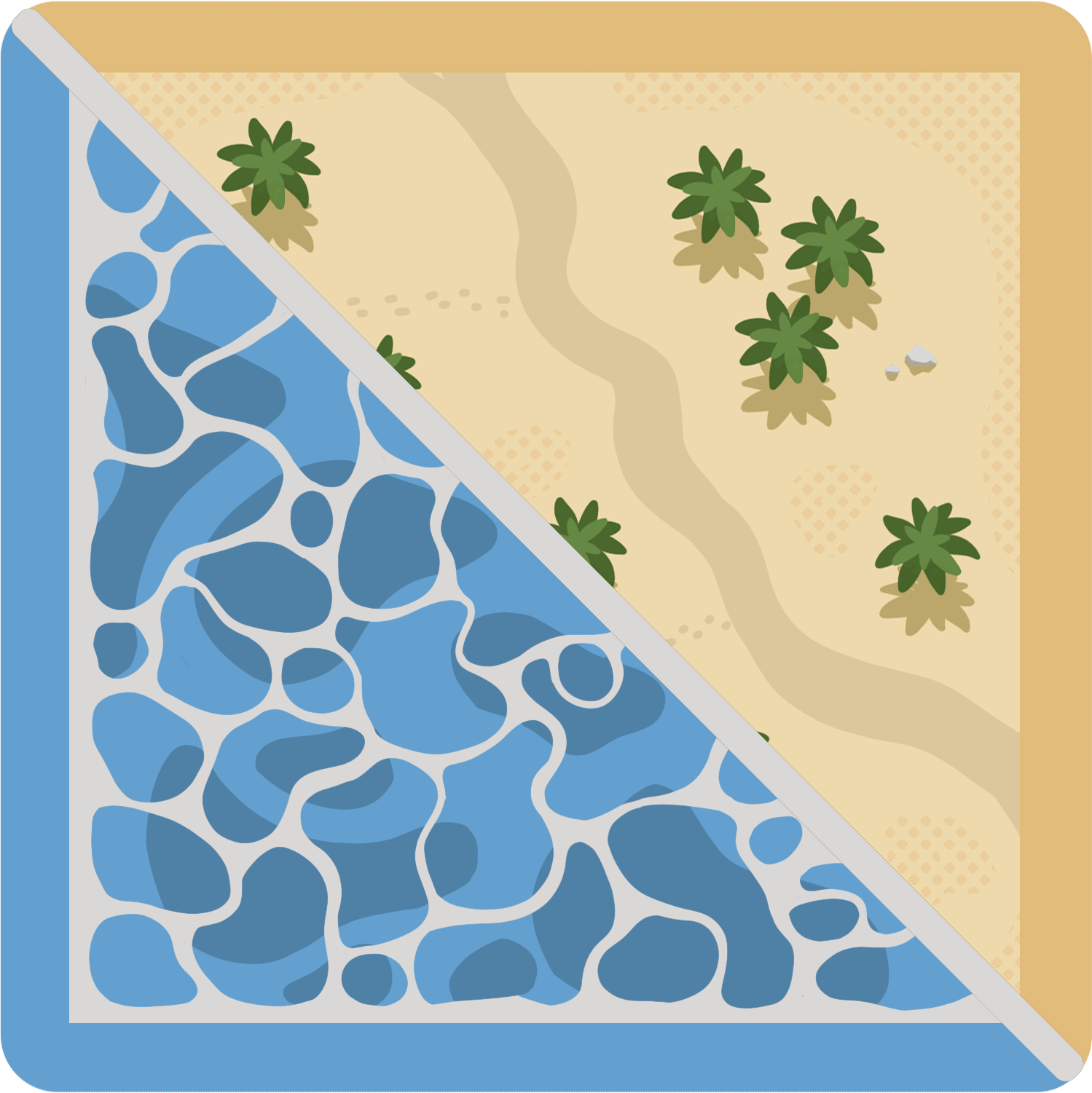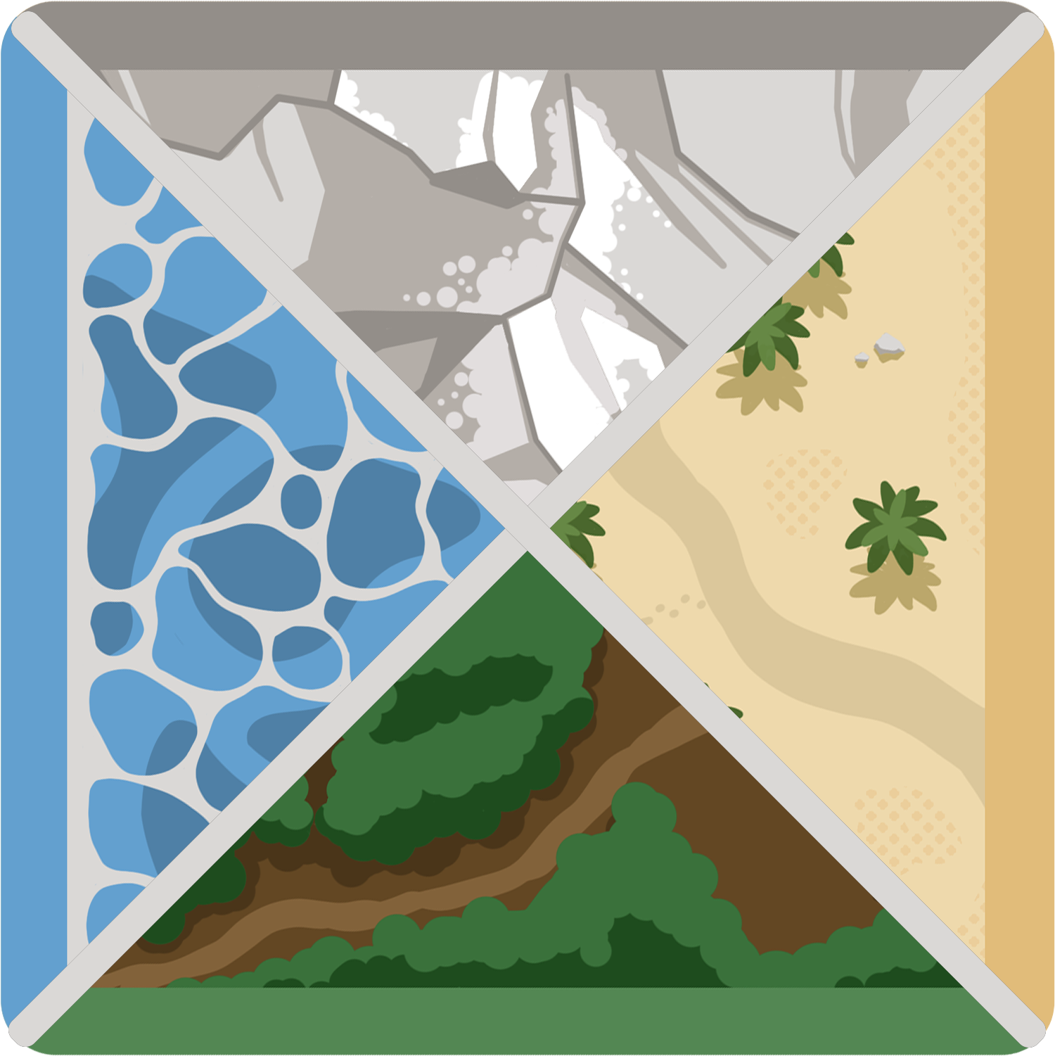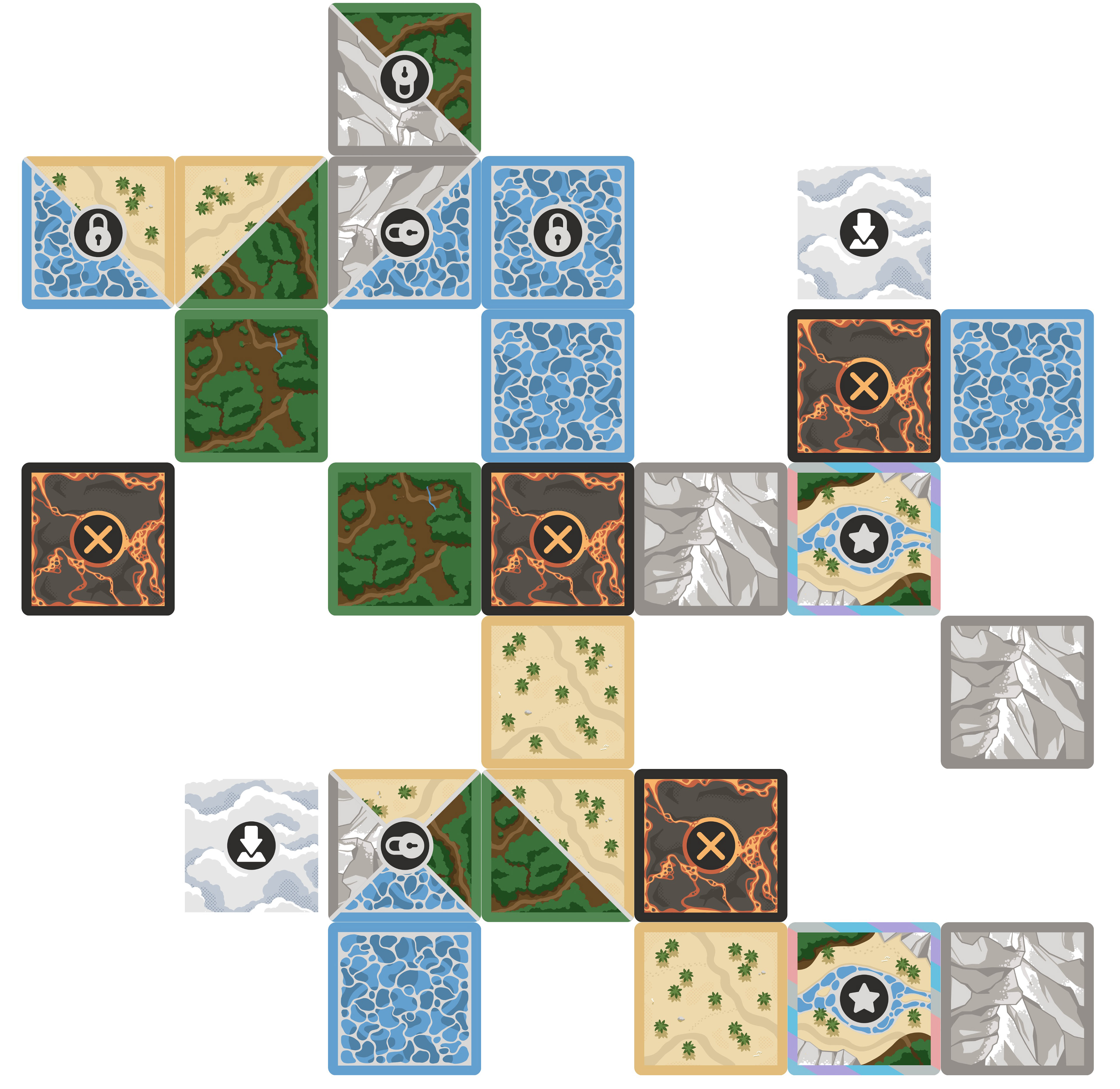 I looked at other games that handled tile based gameplay, specifically Catan and Scythe. Drawing from these inspirations, I wanted to create a series of island segments that players would place together to form a large land mass. Giving the impression that they are revealing/exploring this deserted island one tile at a time