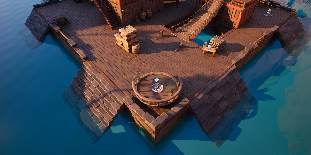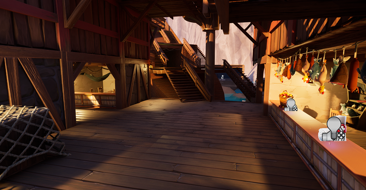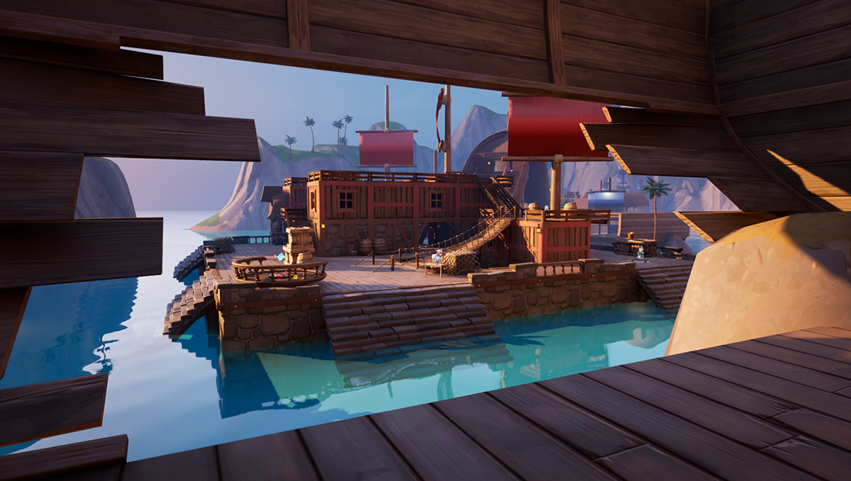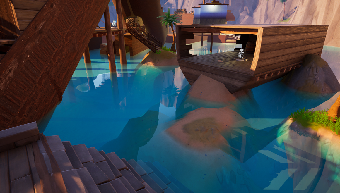 The original design for the spawn area featured 2 pirate ships, where players would leap off the deck into the water as if they just docked at the port. After testing with players, I realized that having large ships at spawn distracted the player and reduced their sense of direction, as there were multiple other boats and sails around the map. To simplify this, I turned the spawns into pieces of a ship's hull that have been broken and stuck atop rocks.